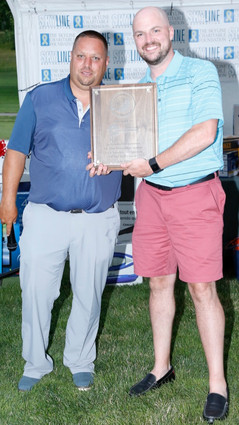 (L-R) Skyline's President, John Tsampas, and Executive Vice President, Jasen Geragthy, present plaques to tournament sponsors Roy Vollmer, M&T Bank; William Laffey, Spring Scaffolding; Vito Pela, Extech Building Materials; and Joe Vullo, Sika Corporation.